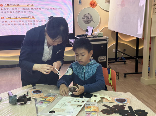 展厅内,同学们手持定制作业单,近距离观察文物寻找答案。教育员还延伸介绍了古代印章的发展脉络,帮助同学们构建知识框架。互动环节里,同学们亲手制作 “多面印” 折纸模型,并在模型上盖上独孤信主题纪念章,将双节文化记忆带回家。