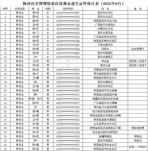 为了方便观众朋友们认领遗失证件,陕西历史博物馆特为您提供遗失证件电话查询服务,请以下表格中所示的证件持有者,尽快致电我馆4000293806服务热线,查询领取您的遗失证件。