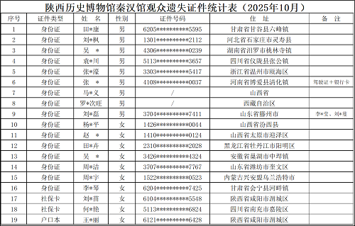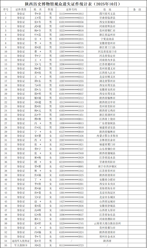 为了方便观众朋友们认领遗失证件,陕西历史博物馆特为您提供遗失证件电话查询服务,请以下表格中所示的证件持有者,尽快致电我馆4000293806服务热线,查询领取您的遗失证件。