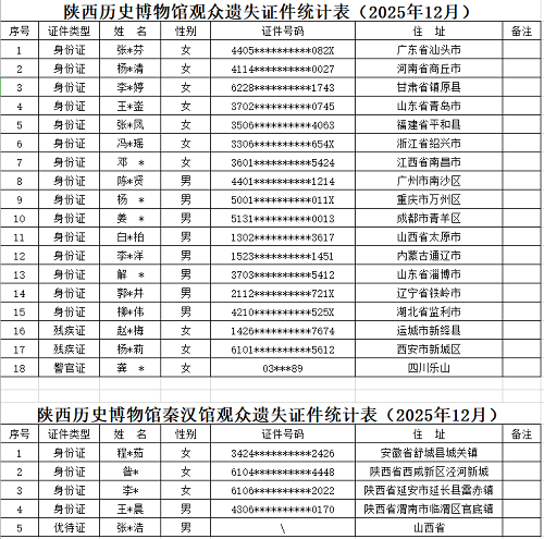为了方便观众朋友们认领遗失证件,陕西历史博物馆特为您提供遗失证件电话查询服务,请以下表格中所示的证件持有者,尽快致电我馆4000293806服务热线,查询领取您的遗失证件。