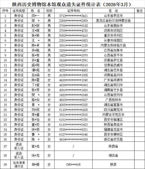 为了方便观众朋友们认领遗失证件,陕西历史博物馆特为您提供遗失证件电话查询服务,请以下表格中所示的证件持有者,尽快致电我馆4000293806服务热线,查询领取您的遗失证件。