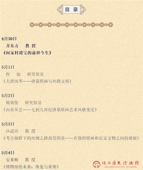 栏目依托“历博讲坛”学术讲座视频资源库,围绕“博物馆里看文物”和5.18国际博物馆日“博物馆的力量”主题,选取与陕西历史博物馆馆藏唐代文物和博物馆发展密切相关的讲座视频,设计了5期讲座回放。讲座回放信息通过陕西历史博物馆微信公众号、“历博讲坛”微信公众号错峰发布,每天上午9:00—10:00向公众推送。经统计,栏目最终收获了35215人次的浏览量,增进了公众对唐代文物的丰富文化内涵和当今博物馆发展趋势的了解。