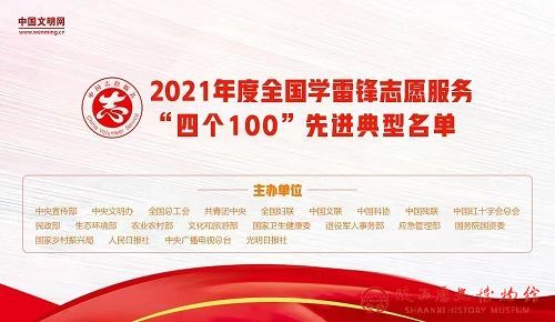 2022年5月11日,中央宣传部、中央文明办等部委共同主办推选的2021年度全国学雷锋志愿服务“四个100”先进典型名单正式公布。陕西历史博物馆(以下简称陕历博)“流动博物馆”志愿服务项目凭借出色的志愿服务、优秀的活动案例、良好的活动效果,荣获全国学雷锋志愿服务“四个100”先进典型荣誉——“最佳志愿服务项目”。这是陕历博继2019年度荣获全国学雷锋志愿服务“四个100”先进典型荣誉——“最佳志愿服务组织奖”后再获殊荣。
