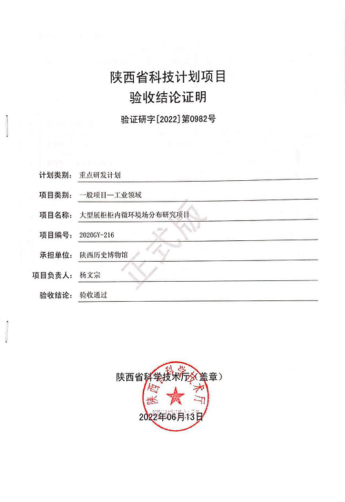 近日,陕西省科学技术厅科技项目管理服务中心对执行期满未结题验收的项目进行集中验收,经验收委员会审核,陕西历史博物馆杨文宗研究馆员主持的“大型展柜柜内微环境场分布研究项目”(项目编号:2020GY-216 )顺利通过验收。