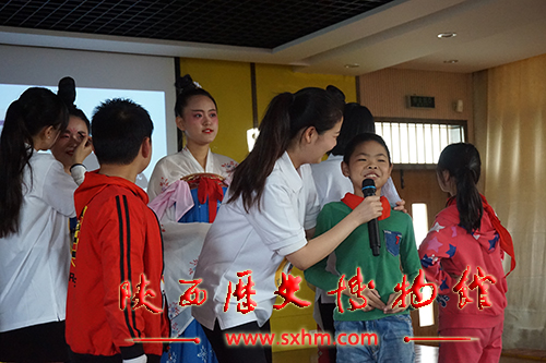 本次活动中,我馆"流动博物馆"为嘉兴市友谊小学的同学们带去了以"丝路拾遗"为主题的精彩内容,着重展示了丝绸之路起点城市长安的魅力、丝绸之路的历史渊源、丝绸之路上的中外文化交流以及陕历博所藏汉唐时期的代表性"丝路文物"。活动受到了同学们的热烈欢迎和积极参与,在听讲过程中,他们高声整齐地回答提问;抢答问题时,争先恐后地举起小手。被选中回答的同学毫不胆怯,清脆果断的声音在教室响起,赢得了所有人的掌声。进行到唐装秀的环节时,同学们的目光被讲台上身着靓丽唐代服饰的"流动博物馆"志愿者深深吸引,他们一边认真听讲一边记录。当盛装打扮的志愿者们走下讲台来到他们身边时,同学们更是热情地与志愿者交流,询问装扮的名称并认真记录下来。最后的唐代妆容体验将活动气氛推向了高潮,同学们围在志愿者身边,满心欢喜地等待着志愿者们将花钿贴在额头,将面靥点在脸颊。