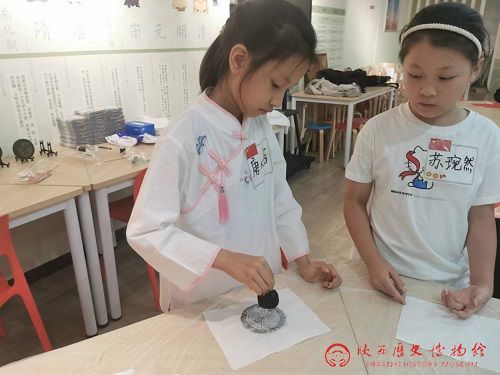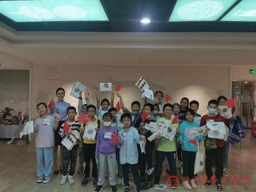 在活动开始前,教育员带领同学们通过观看视频的形式参与升国旗仪式,并齐唱国歌,为祖国庆生。活动中,教育员首先引导同学们思考“家”与“国”的关系,让同学们了解“家”与“国”是相互依存,互为依托,缺一不可的,家是国的缩影,国是家的延续。随后,同学们通过对“家”字结构的观察引出课程的主题“喜迎二十大,欢乐度国庆——小小瓦当里的‘家国天下’”,让同学们了解了瓦当在我国古代建筑中的重要作用与意义。之后,怀着对不同时代瓦当的好奇,同学们带着活动任务跟随教育员走进《陕西古代文明》展厅,感受各个时代瓦当的魅力,从周的半圆形瓦当到圆形瓦当,从战国动物纹瓦当到汉代四神瓦当、文字瓦当,再到唐代莲花纹瓦当,同学们目不暇接,惊叹连连。参观结束后,教育员带领同学们回顾并总结今天所学的知识,并组织同学们亲自动手制作瓦当拓片,同学们跟着教育员的步骤将瓦当上的文字或图案清晰地拓印在纸上,感受古代瓦当设计之美。活动结束后,同学们纷纷感叹道,“参加今天的课程我才知道,瓦当不仅是中国古代重要的建筑材料,也是中华民族的艺术瑰宝,在国庆节参与这样的活动真是太有意义了!”