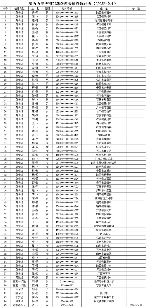 为了方便观众朋友们认领遗失证件,陕西历史博物馆特为您提供遗失证件电话查询服务,请以下表格中所示的证件持有者,尽快致电我馆4000293806服务热线,查询领取您的遗失证件。