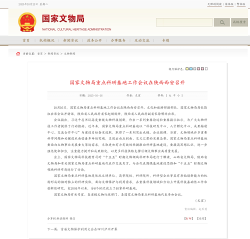 会上,国家文物局科技教育司对“十五五”时期文物领域科研布局进行了解读,山西省文物局、陕西省文物局和有关国家文物局重点科研基地代表作交流发言。与会代表围绕基地建设思路和“十五五”时期文物领域科研布局进行了讨论。国家文物局有关司室、各省级文物行政部门、各国家文物局重点科研基地代表参加会议。(以上引自《陕西日报》)