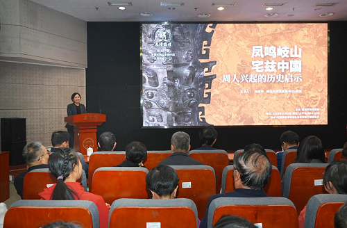 11月2日上午,由我馆主办的大型公益学术讲座“历博讲坛”第127期在陕历博社会教育部二楼报告厅和线上成功举办。此次讲座是我馆策划实施的“吉金·中国”展览配套系列讲座“青铜文明与早期中国”的第十七讲,特邀西北大学党委副书记、校长孙庆伟先生,以《凤鸣岐山 宅兹中国——周人兴起的历史启示》为题进行讲演,我馆馆长庞雅妮主持讲座。本次讲座为线下讲座,共有文博单位、高校师生、社会人士等300余名听众现场听讲。