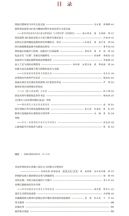 本辑聚焦丝绸之路研究领域的文化互动、美术考古、宗教传播、文物研究、历史事件等关键议题,收录高质量学术论文25篇。本期内容包括对传统石窟艺术、佛教图像的深入解读,既有对敦煌莫高窟第285窟南北壁8小室门楣对鸟象征意义的解读,以及该窟西壁外来元素、窟顶“山中禅定僧”图像意义的重审,也包含麦积山石窟西魏窟造像的西安西魏样式分析、四川南朝佛教造像中联珠纹研究等内容。还涉及了八思巴文与回鹘文文献的释读、伊朗萨法维王朝的驿站制度、蒲甘艺术研究进展等跨文化议题,展现了丝绸之路研究在时间与空间上的广泛联系。除此之外,也关注了丝路沿线政治、经济与文化交流的历史细节,如武周政治中的华严经美术、查士丁尼时期的国际丝绸贸易、杨和征伐石国史事、都曼叛乱事件等,体现了多学科、多视角的研究方法。