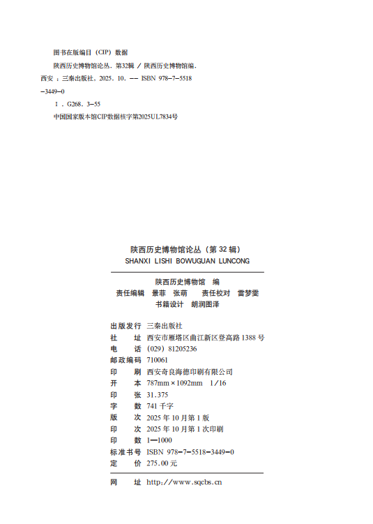 陕西历史博物馆编、庞雅妮主编的《陕西历史博物馆论丛(第32辑)》已由三秦出版社于2025年10月正式出版。本书是《陕西历史博物馆论丛》第32辑,分为历史文化研究、文物考古研究、藏品与艺术史研究、博物馆研究、文物保护研究、学术博览等六个栏目,收入文章47篇,共74.1万字。