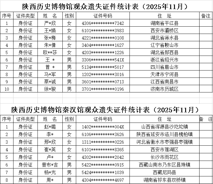 为了方便观众朋友们认领遗失证件,陕西历史博物馆特为您提供遗失证件电话查询服务,请以下表格中所示的证件持有者,尽快致电我馆4000293806服务热线,查询领取您的遗失证件。