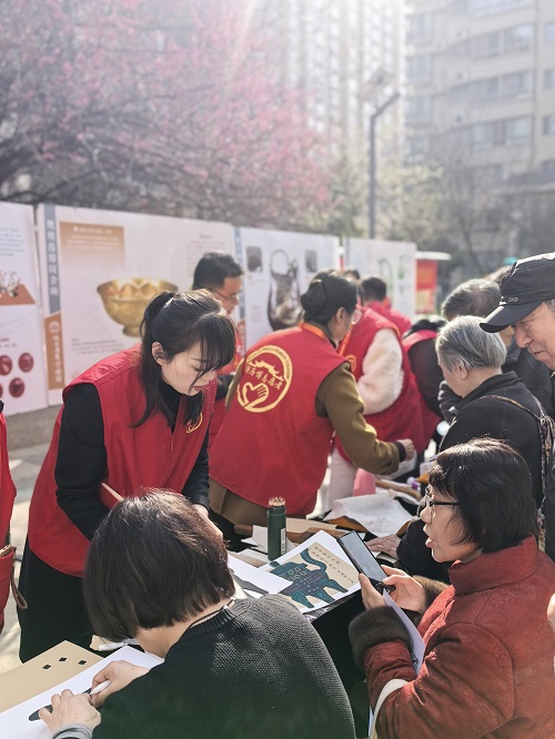 与此同时,室外“流动博物馆”区域开展的文物展板讲解吸引了大批居民。志愿者手拿相关文创产品,细致讲解文物故事,多件馆内精品文创让居民近距离观赏、触摸,实现“家门口逛博物馆”的美好体验。在瓦当拓片、青铜器填色等体验区,志愿者现场示范上纸、敲打、上墨、揭取等传统拓片技艺,居民亲手在瓦当纹样上完成拓印、创作专属青铜器作品,近距离感受非遗文化的独特魅力。