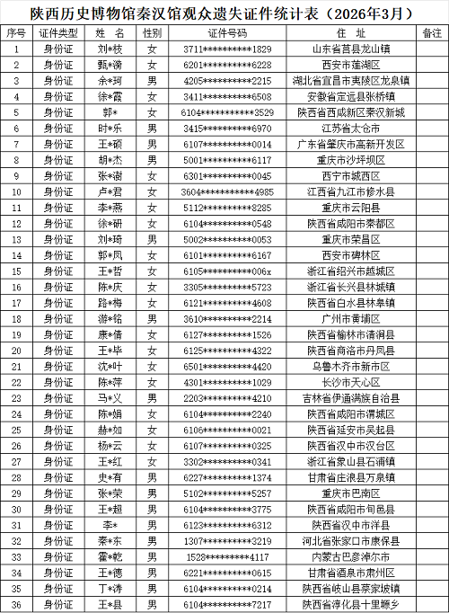 为了方便观众朋友们认领遗失证件,陕西历史博物馆特为您提供遗失证件电话查询服务,请以下表格中所示的证件持有者,尽快致电我馆4000293806服务热线,查询领取您的遗失证件。