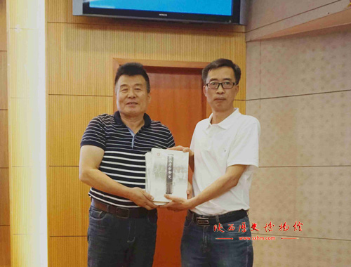讲座开始前,陕西历史博物馆科研管理处处长谭前学代表陕西历史博物馆接受罗宏才捐赠自己的著作《陕西考古会史》与《徐旭生陕西考古日记》。