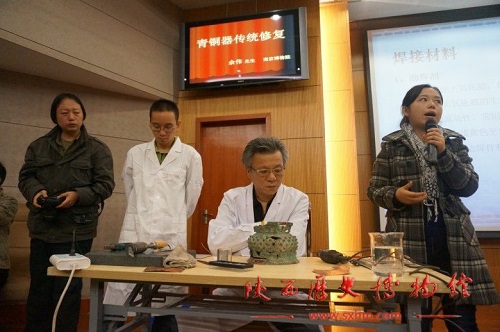 11月14日,我馆特邀请青铜器修复苏派传人、南京博物院余伟先生讲授并现场演示了青铜器传统修复。程旭副馆长主持讲座,与陕西省考古研究院、碑林博物馆等陕西文博界同仁和来自西北大学、陕西师范大学等高校的师生、文物爱好者一起聆听了讲座、观看了现场演示,并共同就相关问题进行了热烈探讨。