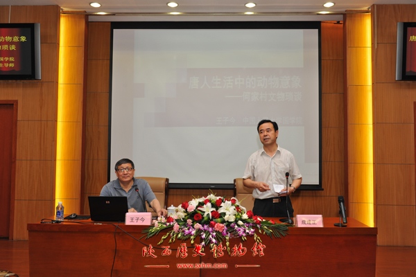 《唐人生活中的动物意象——何家村文物琐谈》,对于我馆藏的三件何家村金银器上动物纹所蕴含的文化内涵做了深入的分析,以大量的文献资料为佐证进行考据。以往关于“舞马衔杯”银壶的解说,多关注唐玄宗时故事,王先生考据早在三国时期已有的“舞马”记录,显示这种动物表演已经成为炫耀升平盛世的传统。对“鎏金双狐纹双桃形银盘”,王先生重新定名,认为应更名为“金涂两獾双桃银盘”。他从动物学的角度对银盘上的“狐”重新考察,结合唐宋人的生活习俗对“双欢”、“合欢”美好寓意,以“獾”喻“欢”,早已成为象征习惯。当时人们习用所谓“两欢”或“双欢”形容友情洽好亲密,亦暗喻异性情爱美好。“兽首玛瑙杯”是何家村窖藏的重器之一,王先生从它的形制入手,考察这种犀角杯的流传。“犀杯”,作为饮器长期使用,早在史前时代就有此种样式的饮具,后来历代多有犀角制成的杯子。这一现象,很可能与古人相信犀角可以验毒、辟毒的意识有关。“犀杯”又是东西文化交流的物证。日本和韩国出土的相关器物,值得我们注意。王先生对文献资料和考古学材料了如指掌,讲座以图文并茂的形式展现给大家,体现了他深厚的治学功底。