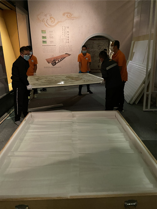 2021年9月7日至9月9日,陕西历史博物馆保护修复部壁画保护科工作人员金紫琳、孟元亮前往北京首都博物馆完成《玄武图》壁画撤展工作。