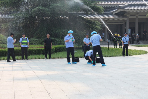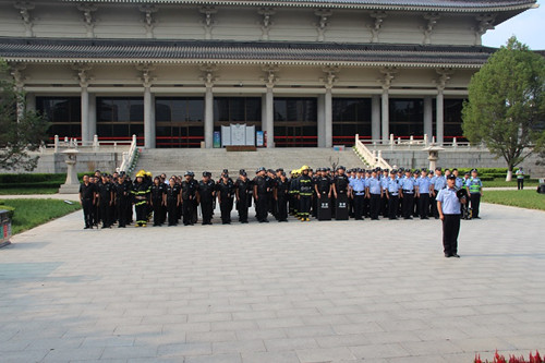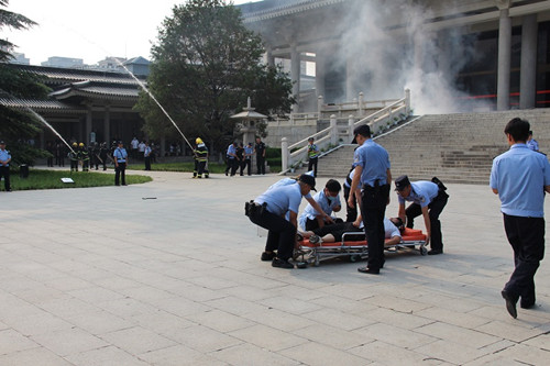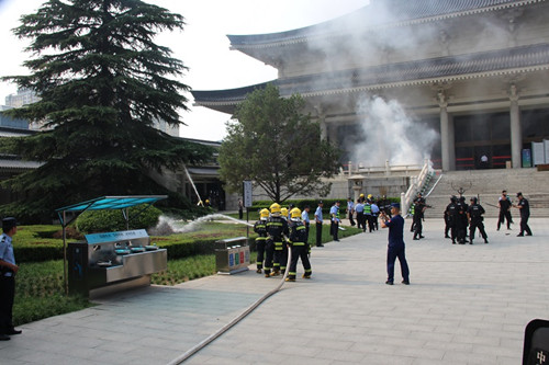 演练以展厅内有人蓄意纵火和破坏为背景展开。随着报警铃声响起,陕历博应对突发事件预案随即启动,根据现场总指挥命令,演练人员迅速按照《陕西历史博物馆处置突发事件预案》部署展开行动,各参演的公安、旅游、城管、卫生及消防救援一线处置人员,与陕历博安保大队迅速成立现场警戒、灭火救援、疏散以及抓捕等小组,各任务小组按照职责任务分工,密切协同配合,整个演练过程严密紧凑、严肃认真、沉着冷静,尤其是在紧急疏散、灭火救援、文物抢救等任务中,参演人员进入情况快,疏散、救援及文物抢救动作迅速有效,出色的完成了参演任务,达到了预期的效果。