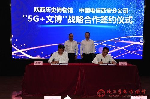 在第45个国际博物馆日和第53个世界电信日到来之际,陕西历史博物馆与中国电信股份有限公司西安分公司“5G+文博”战略合作协议签约仪式在陕历博多功能厅隆重举行。陕西历史博物馆党委书记、馆长侯宁彬,党委委员、副馆长魏成广,中国电信西安分公司党委书记、总经理田超,党委委员、副总经理刘山林等出席签约仪式。