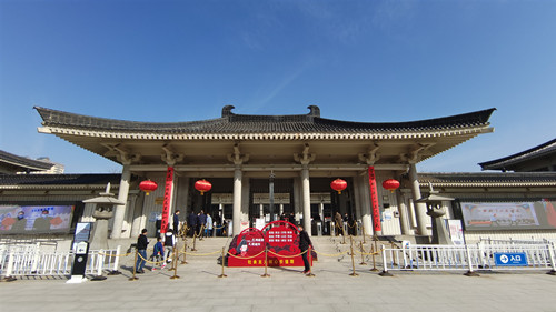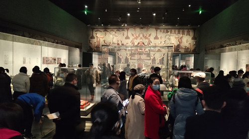 2021年春节期间,陕西历史博物馆坚持“两个落实”,一是落实疫情防控各项举措,前区重点部门节前开展疫情防控专题培训和馆区安全全面体检,在观众接待中执行“一客一检查”“一客一用一消毒”等安全防疫措施,确保防疫工作无死角无漏洞。二是落实限量、预约、错峰的观众接待要求,实行“应约尽约”和分时段预约参观,每日观众接待量控制在最大承载量的75%(9000人)以内,保障人民群众就地过年期间享受安全、优质的文化服务。