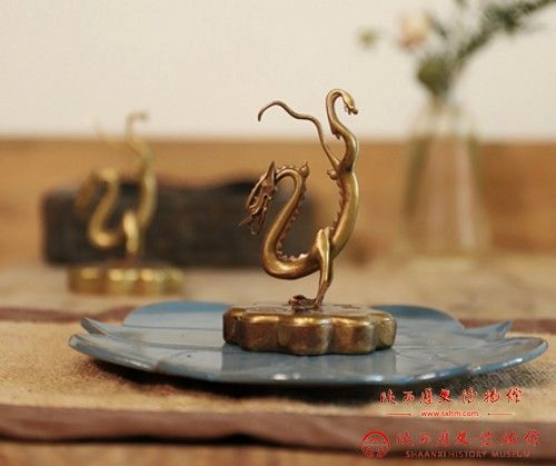 “盛引云光·香炉”设计源于陕西历史博物馆馆藏唐代文物鎏金铁芯铜龙。铜龙身体细长,两只有力的前脚紧扣地面,龙头与上身呈“S”型,体现出唐代龙的生动美与气势美。