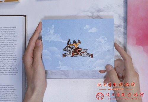 “‘陕陕’的文物惹人爱·绣片”系列明信片创意源于陕西历史博物馆的多件经典馆藏文物。绣片采用多彩绣线混合金线织造,可反复粘贴使用,融入服装、日常用品等多重场景。同时印有文物信息的绣片作为明信片使用,集观赏性、实用性为一身。