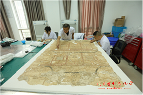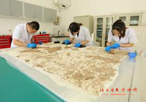 陕西历史博物馆自承担甘肃省文物考古研究所慕容智墓出土壁画的保护修复项目后,便专门组织了一支高水平的壁画修复团队,由壁画修复专家杨文宗带队,队员包括陕西历史博物馆保护修复部副主任王佳、保护修复部壁画保护科李倩、冯云鹏、李超等经验丰富的修复人员。