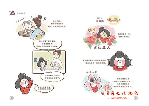 《唐妞驾到》是一本将“唐妞”形象融合进唐朝历史文化的漫画科普书,由我馆文创工作者和“唐妞”设计师二乔先生共同编剧、策划、设计出品。全书共有13个篇章,是以“唐妞”为人物主线展开的一系列故事,内容囊括唐妆、购物、建筑和生活等方面。作为陕西历史博物馆的文创IP代言人,“唐妞”以馆藏文物“粉彩女立俑”为原型,留其妆容、发饰等具有辨识度的传统历史形象特点,又将国画的绘画特色与动漫二次元的表现形式相结合,以突破固有视觉形式的表达方式来诠释唐朝历史文化题材,并将硬核唐文化知识融入漫画的各个篇章,赋予读者全新的阅读体验,创造出了具有人文特色的现象级漫画文创。