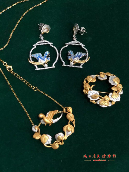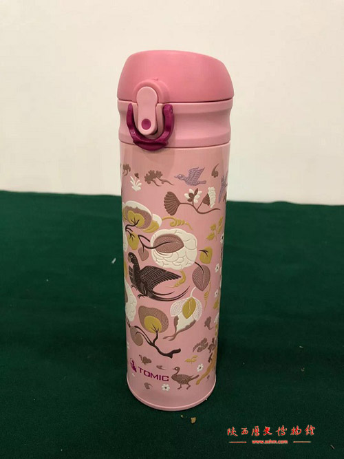 鹦鹉纹系列首饰的设计受我馆馆藏鎏金鹦鹉纹提梁银罐的启发,融简洁、时尚为一体,选用材料典雅、工艺考究;“花舞大唐”保温杯创意来自我馆馆藏鎏金鹦鹉纹提梁银罐纹饰,采用316“食用”钢、3D及丝网膜工艺,外观优美、手感极佳。