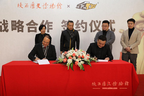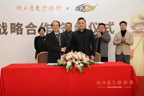 12月18日,陕西历史博物馆党委书记、馆长强跃代表我馆与中国衍生品公司52TOYS的签署战略合作协议,双方结成合作伙伴关系。双方达成以下两点共识:一是举办第二届文创设计大赛暨第三届52TOYS原型设计大赛 --“文物超活化”的深度合作。专家选取我馆8件极具代表性的馆藏文物“日己觥、杜虎符、金怪兽、鎏金铜龙、三彩三花马、三彩骑马俑、三彩披帛女立俑、彩绘双髻女立俑”为搭载的创作推荐原型,以“文物超活化”为主题,以“超越传统,活化历史,传承文化”为宗旨,让艺术家和设计师以一个全新的视角去诠释历史文物,希望通过此次大赛带动更多年轻人了解并传承历史文化。二是以我馆的馆藏文物为对象共同开发“超活化”系列产品定制款。我馆负责对文物文化元素梳理、定位指导及产品监制,并在馆内增设“超活化”系列专区销售该产品;52TOYS则负责产品的创意设计、生产及营销模式方面的开发。