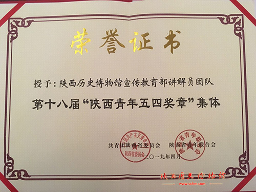 2019年4月28日,在纪念“五四”运动100周年之际,陕西历史博物馆宣传教育部讲解员团队经过组织推荐、资格复审、评委投票、考察公示后,喜获第18届“陕西青年五四奖章”。这是共青团陕西省委、陕西省青年联合会授予我省青年及青年团体的最高荣誉。
