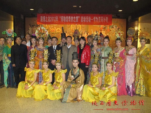 为响应国家“文化大发展大繁荣”的政策,达到“文化惠民、服务群众”的目的。陕博之友协会特邀众多知名专家学者与博物馆之友一起走进我国首座以唐代墓室壁画为主要陈列内容的唐代壁画珍品馆。启动仪式在唐墓壁画馆大型绘绣壁画《唐乐舞》前伴随着悠扬的古乐和绚丽的唐舞正式拉开序幕。陕西历史博物馆成建正馆长首先讲话,他表示希望利用珍贵的文物资源建立起陕博与社会的联系,将祖国的优秀文化遗产深深地植根于观众心里。“博物馆奇妙夜”活动是一次全新的尝试,大家不仅是博物馆的观众,也是博物馆活动的参与者。希望这样的活动使社会与博物馆联系更紧密,让博物馆走进大众的生活。随后,讲解员分组带领来宾进行参观。在参观过程中,工作人员精心挑选了四幅国宝级壁画进行壁画场景重现。当讲解员带领来宾走到每幅设定好的壁画前,琵琶声响起,身着盛唐装容捧物侍女们优雅地缓步走来、来自异域的热情舞者尽情舞蹈、仪态端庄的唐代官员正在接见外国使节……宣教部的讲解员们摇身变为唐代壁画中的各色人物,一个个仿佛刚从壁画中走来一样,活灵活现地带领大家穿越时空,让所有来宾在体验到“奇妙”的同时,也身临其境地感受唐代的魅力,认识唐代的风貌。参观结束后,工作人员还设计了一个互动环节。嘉宾们可以亲手使用仿唐绘画工具在原尺寸的唐墓壁画线描图上为美丽的侍女涂上颜色。活动的最后,成建正馆长及周魁英处长为陕博特别邀请的六位荣誉会员颁发了荣誉证书及陕博之友荣誉会员证。至此,以“博物馆奇妙之旅”为主题的2012年度陕博之友活动正式启动。参加这次活动的来宾们对此次“博物馆奇妙夜”活动赞不绝口,整个活动现场掌声不断。代表们纷纷表示这次活动将静止的、凝固的文物与生动的表演结合在一起,用这种奇妙的方式诠释历史,解读文物,活动形式新颖、选材独特,是一次有意义的博物馆宣教新尝试。