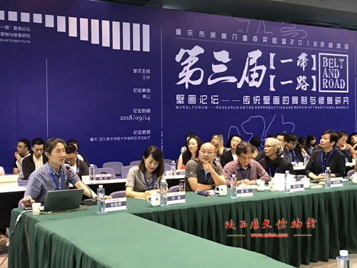 2018年9月14日,由中国美术家协会壁画艺术委员会、四川美术学院、重庆市美术家协主办 “第三届‘一带一路’壁画论坛-传统壁画的复制与修复研究”暨作品展在重庆举办,陕西历史博物馆副馆长程旭、文物交流部部长文军、壁画基地办公室主任杨文宗、文物交流部业务科副科长刘江英参加此次论坛。