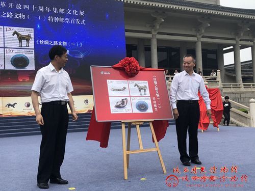 庆祝改革开放四十周年集邮展暨《丝绸之路文物(一)》特种邮票首发活动特选定5月18日次日、于5月19日上午在我馆前庭院举行,陕西省文物局副局长周魁英亲临现场参加特种邮票的揭幕仪式,省委宣传部政研会秘书长王战军、全国集邮联合会副会兼秘书长张玉虎、我馆馆长强跃为集邮展分别发表致词。之后强跃馆长、《丝绸之路文物(一)》邮票设计师陈景异进行现场签售,还举行了集邮品秒杀、手绘明信片等丰富多彩的现场活动。同日,宝鸡、咸阳和安康市邮政分公司也在当地举办邮票首发活动,据悉,该套邮票四枚邮票设计题材分别源于我省安康出土的《鎏金铜蚕》、咸阳茂陵历史博物馆的《鎏金铜马》、我馆的《兽首玛瑙杯》、法门寺博物馆的《丹芭纹描金琉璃盘》,其中《鎏金铜蚕》《兽首玛瑙杯》系我馆馆藏文物。