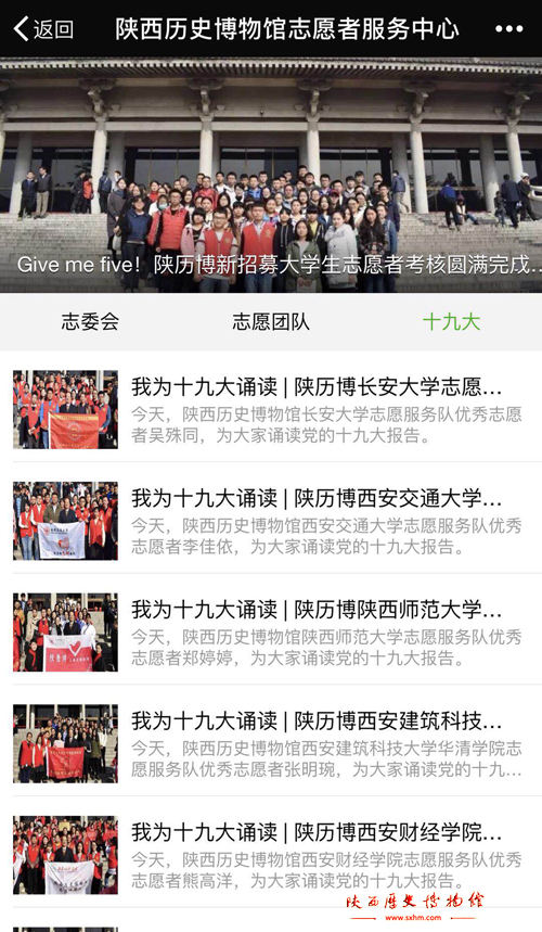 为深入学习宣传贯彻党的十九大精神,引导文博志愿者原原本本、原汁原味学习好党的十九大报告。2018年1月1日起,陕历博志愿者服务中心在志愿者中组织开展了“我为十九大诵读”系列活动,截至1月22日,已举办十九大诵读活动10场,超过800名志愿者参加。