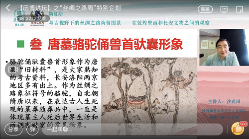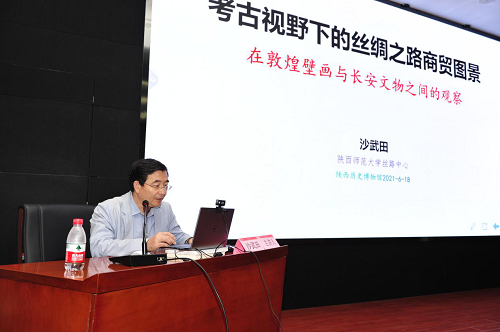 6月18日,由陕西历史博物馆主办的第81期“历博讲坛”顺利举行。本次讲座特邀陕西师范大学历史文化学院教授、博士生导师沙武田作题为《考古视野下的丝绸之路商贸图景——在敦煌壁画和长安文物之间的观察》的讲座。陕历博科研规划部处长杨效俊主持讲座。作为“2021丝绸之路周”西安分会场的重要要活动,吸引了公众广泛的关注。截止发稿,通过陕历博官方微博、B站,汉唐网微博,中国知网等四家平台,讲座在线浏览人次达11121人次。同时,100余位听众现场聆听了讲座。