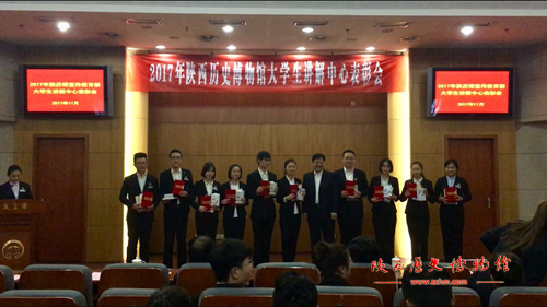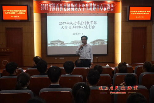11月22日,2017年陕西历史博物馆大学生讲解中心表彰会在陕西历史博物馆多功能厅隆重举行。陕西历史博物馆党委书记、馆长强跃、副馆长田景超、副馆长魏成广及来自十三所高校的90余名大学生讲解员出席了表彰会。本次大会对2017年大学生讲解中心评选出的十佳大学生讲解员、优秀大学生讲解员、讲解标兵、优秀讲解队队长等获奖同学依次进行表彰。