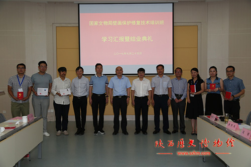 国家文物局人事司专家与培训处周君生副处长、甘肃省文物局朱森平处长在结业仪式上对此次培训任务的圆满完成给予了充分肯定,认为次培训班由敦煌研究院承办,具有得天独厚的优势;同时,不仅国家文物局高度重视,各个文博单位对人才培养也高度重视,选派学员学历高、技术突出;其次,这培训中采用理论授课,修复实践、现场观摩等多种方式,授课内容丰富;学员的学习积极性高,学习效果非常好,达到甚至超过了预期的目的;最后,敦煌研究院王旭东院长呼吁在更大的范围、更高的层次上来加强文化遗产保护领域的人才培养,建立文物行业自己的人才培养体系,并希望在座的学员今后能够加强合作,通过课题的形式对自身的保护修复工作进行研究和总结并指导今后的保护工作,将培训的收获充分运用到各自岗位当中去,并将敦煌精神带回去,更好的服务于文物保护事业。