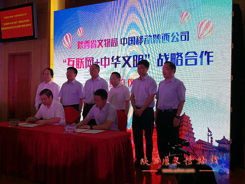 8月2日,陕西省文物局与中国移动通信集团陕西有限公司联合举办、陕西省博物馆教育联盟等承办的“互联网+中华文明”战略合作签约暨“首届陕西历史文化动漫游戏大赛”启动仪式在我馆举办。省文物局局长赵荣和副局长罗文利、贾强,移动集团陕西有限公司党委书记、董事长、总经理卓峰和副总经理蒋文隆等出席仪式。