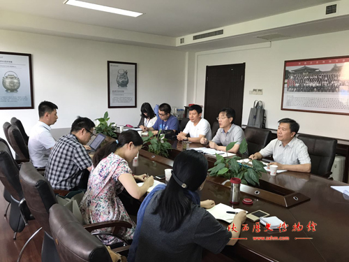 2017年7月20日,石窟寺文物数字化保护国家文物局重点科研基地(浙江大学)主任鲁东明,专职副主任刁常宇一行4人来陕西历史博物馆交流学习。并与西北工业材料学院党委书记董文强,陕西省壁画保护修复研究基地常务副主任晏新志,陕历博壁画基地办公室主任杨文宗、副主任王佳以及基地办公室业务人员进行了交流座谈。