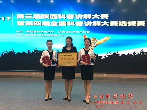 4月19日,由陕西省科学技术厅、陕西省科学技术协会主办的第三届陕西科普讲解大赛暨第四届全国科普讲解大赛选拔赛在西安落下帷幕。来自全省近40家博物馆、展览馆、科研院所、大中院校、医疗气象等单位的69名选手报名参赛,陕西历史博物馆选派的宋婷婷、张洁两名选手在为期两天的激烈角逐中脱颖而出,分别荣获大赛一等奖和三等奖,并被授予“2017年陕西十佳科普使者”称号。同时陕历博还荣获大赛组委会颁发的“优秀组织奖”。