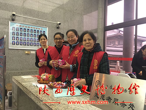 春节假期的每天上午,我馆宣教部领导都会向来馆服务的志愿者拜年并送上新春祝福和感谢,感谢志愿者们放弃与家人团聚的时间,在博物馆最需要的时候坚守在第一线志愿奉献。春节黄金周期间,陕历博每天游客爆满,在这种本该阖家团聚的日子里,志愿者们依旧秉承“奉献、友爱、互助、进步”的志愿精神和“行善立德”的志愿服务理念,为广大游客志愿服务。在志愿者服务台、讲解员联系处、语音导览租借处等一线服务岗位都可以看到志愿者维持秩序、问询答疑的身影。