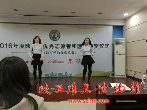 此项活动是三秦都市报、公益记者公众号联合阿里巴巴集团及全国100多家主流媒体共同发起的大型公益项目,旨在传播正能量,弘扬真善美。据了解,陕历博志愿者团队、陕西蓝天救援队、陕西红丝带志愿者协会等106支优秀志愿者队伍及众多公益组织的优秀志愿者参加了此次评选,评选结果网友投票占了60%,评委投票占40%,最终以得分高低排序评选出十佳志愿者团队和90名“优秀志愿者”。陕历博志愿者团队成绩名列前茅,被授予“优秀志愿者团队”称号。颁奖现场,陕历博志愿者苏白雪、王静为大家带来了一支青春洋溢的舞蹈《咋了爸爸》并向所以来宾送上新春祝福,将现场气氛推向高潮。