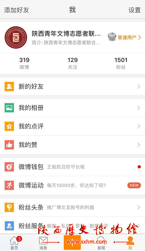 陕西青年文博志愿者联合会于2016年3月9日正式开通了官方微博,内容由文物介绍、文物竞猜、博物馆资讯、中国历史和志愿者精神5大板块组成。截止目前已累计发布微博内容320余条,粉丝人数1800余人,取得了较好的社会影响力。