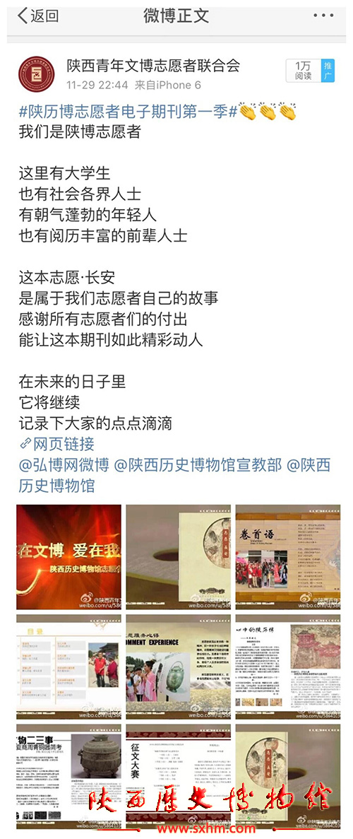 陕西青年文博志愿者联合会电子期刊是所有文博志愿者参与,面向社会公众推出的志愿者自主管理、创作的电子刊物,她的推出创新和完善了联合会微博服务体系的新格局,将文博志愿者的心越拉越近,也标志着陕西青年文博志愿者联合会的影响力日渐增强!我们也希望更多的志愿者用别样的文字讲述自己的志愿生活,积极投稿!日后,陕西青年文博志愿者联合会电子期刊会为公众送上更加精彩的内容。