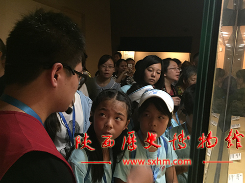 “小葵花”夏令营的孩子们平均年龄不到12岁,都是西安市农民工子女。我馆专门安排了10名志愿者为孩子们提供了热情周到的服务。志愿者们分成5个组,每组都安排有专门的讲解老师和服务人员,大家分工合作,相互配合,用适合小学生年龄特点的语言生动地向孩子们讲述馆藏精品文物及历史背景知识。小营员们被精美的文物深深吸引,一边仔细聆听志愿者生动地讲解,一边认真记着笔记,并不断地与小伙伴们讨论着,一双双眼睛充满了求知的渴望。志愿者讲解形式多样,采用问答形式与孩子们互动,大大激发了孩子们对历史、对文化的探知欲望。2个多小时的参观活动下来,孩子们仍感到意犹未尽,他们不仅被中华民族博大精深的历史文化深深震撼,同时也被志愿者们的奉献精神深深感染。