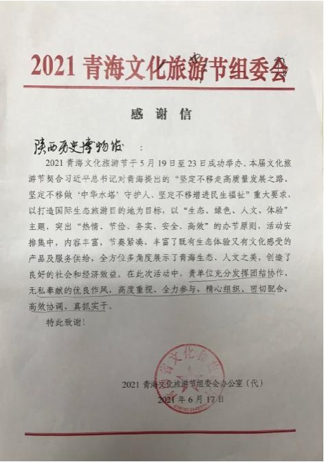 2021青海文化旅游节组委会向我馆致感谢信