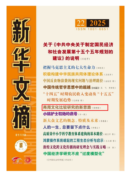 《文博》2025年第4期(总第247期)考古研究栏目中刊登一篇张懋镕先生的文章,题为《商周文化比较研究的新思路》,被《新华文摘》2025年第22期转载。《新华文...